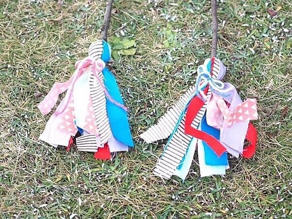 はたき作りが一大イベントになっていて、森で遊びながら材料を探し、家に戻って木の枝に端切れ布を巻き付けています。