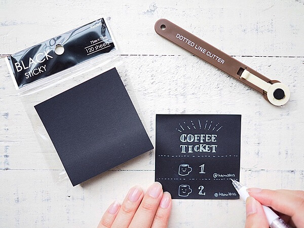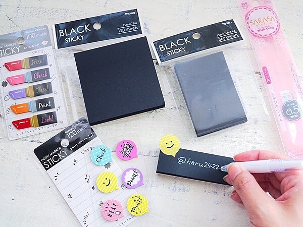 同じくセリアで販売されている「サラサクリップボールペン ホワイト」を使って、黒付箋に文字を書いてみました。
