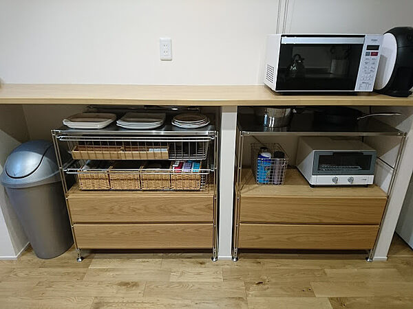 高さ83cmの帆立にステンレス棚やワイヤーバスケット、引出しを組み合わせました。