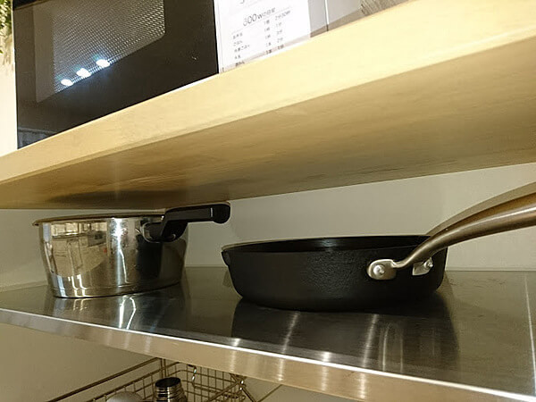 使用後、洗って空焚きしたアツアツのフライパンを棚に置くだけで、収納完了。 とても便利で機能的です。
