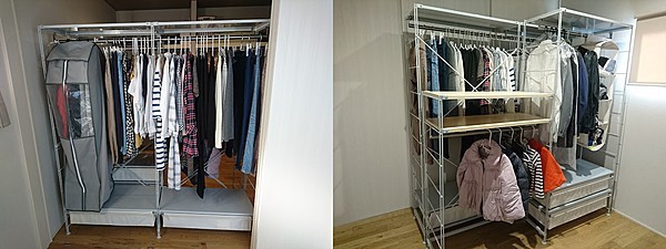 連結したユニットシェルフを背中合わせにして配置し、ウォークインクローゼットの外側からは私の洋服が、内側からは主人と子どものものが取り出せるようになっています。