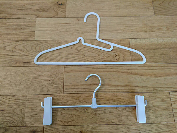 トップスの収納には「ポリプロピレン洗濯用ハンガー・シャツ用」を、ボトムスの収納には「アルミハンガー・パンツ/スカート用」を使っています。