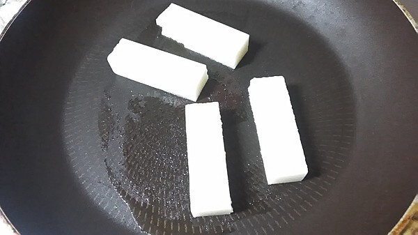 ① 餅を縦に二等分にカットして、ごま油をひいたフライパンに乗せて焼きます。