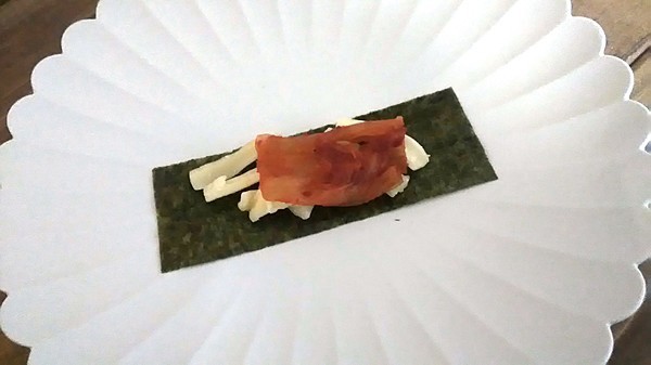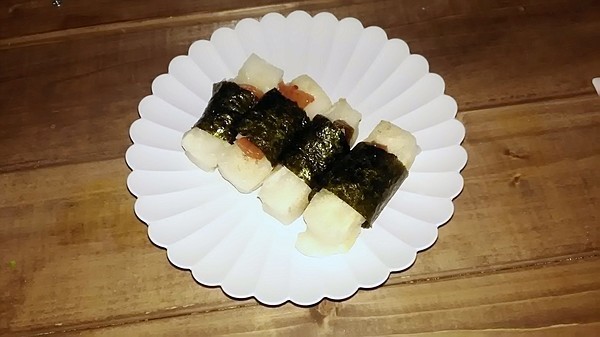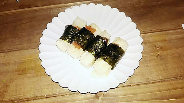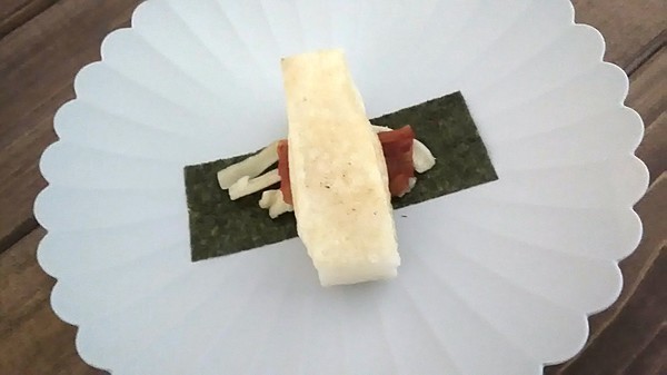 ③ 焼きあがったお餅を乗せ海苔を巻き付けます。