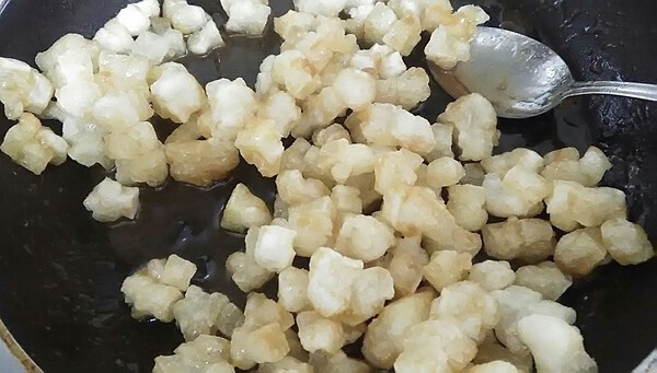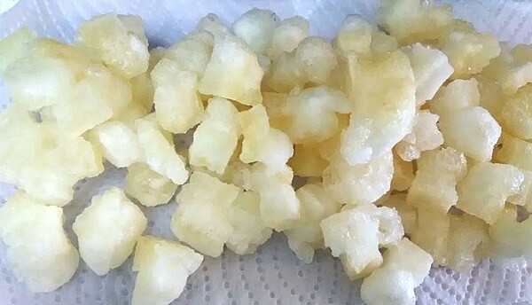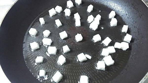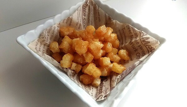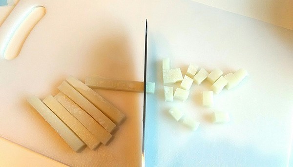 ① 切餅を包丁で約1cm角のサイコロ状になるようにカットします(膨らむので小さめかな?と思うくらいでOK)