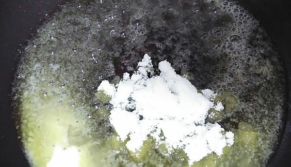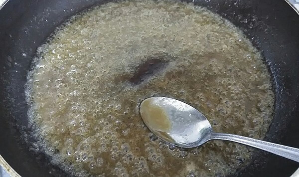④ フライパンにマーガリン、砂糖を入れて温めます。