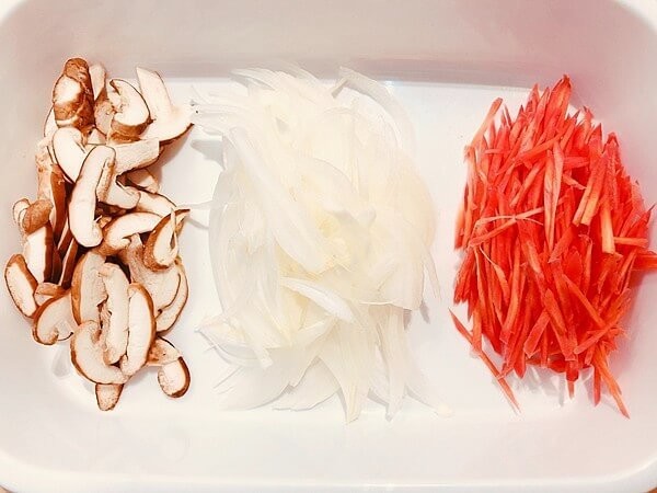 ② 玉ねぎ・椎茸・人参は薄くスライスしておきます。