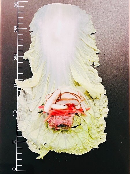 ④ 白菜を広げて②の野菜とサバをのせて端(葉っぱの方)からしっかりと巻いていきます。