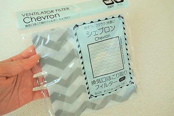 おすすめのシェブロン柄アイテムその1は、換気口ほこりフィルターです。 はさみで自由にカットして、カバー付きの換気扇に貼り付けて使います。(※羽根がむき出しの換気扇には使えないので注意) サイズは30×30㎝。素材は不織布で、本体が2枚、取り付けテープが8枚入っています。