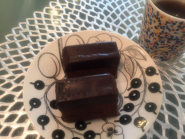 コーヒーや紅茶によく合います。バウムがふんわりしているせいか、チョコはしっかりチョコ感があっても全然しつこくありません。おやつなら、半分でも十分なボリュームだと思います。