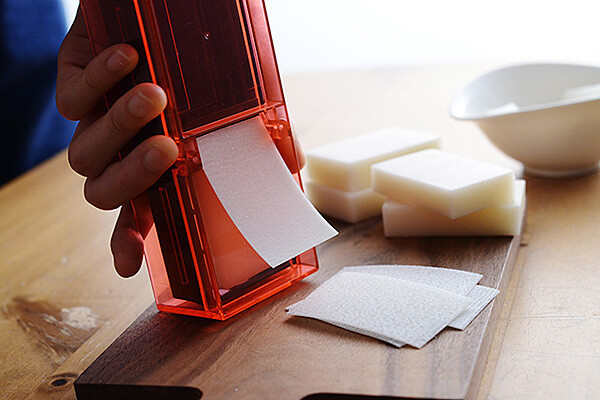 ポップな色のプラスチックの本体にお餅をセットして、握力計測のようにギュッとニギニギ〜ッとすると、安全に1枚ずつスライスできます。