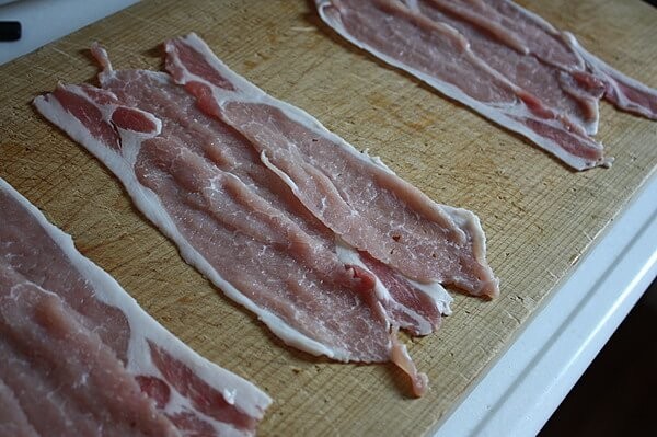 幅10cmくらいにして、半分に切って食べるので、肉を3枚横に並べました。大きさはお好みで調整してください。