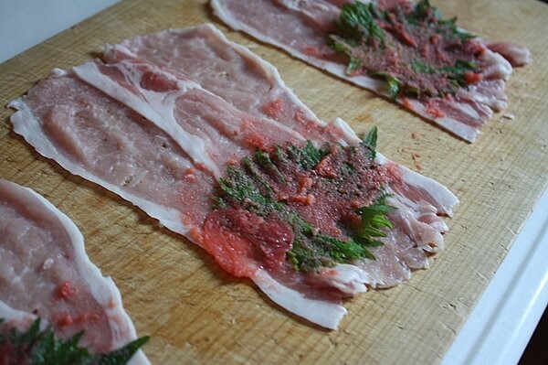 明太大葉ロールなので、豚はモモでもロースでもバラでも薄切りを。