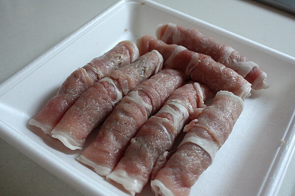 今回はロースしゃぶしゃぶ用の見切り品(半額)を使っていますが、普通の薄切り肉の方がくるくるがはっきり出るのでオススメです。