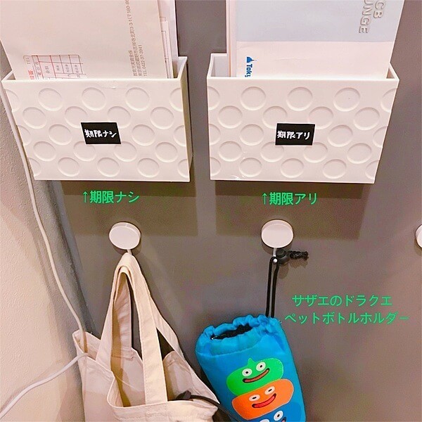 このコーナーのすぐ横が「期限あり/期限なし」のレターラックです。冷蔵庫のサイドにマグネットでくっつけています。