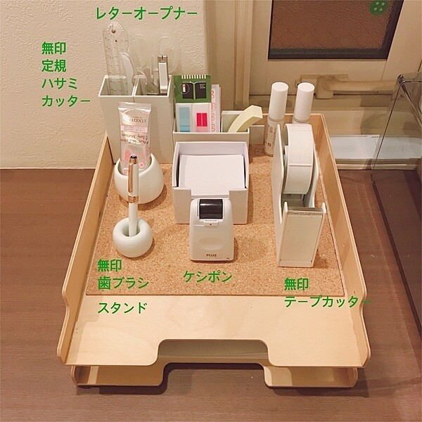 派手になりがちな文房具を無印良品にすることにより、出しっ放しでも散らかっているように見せないためです。
