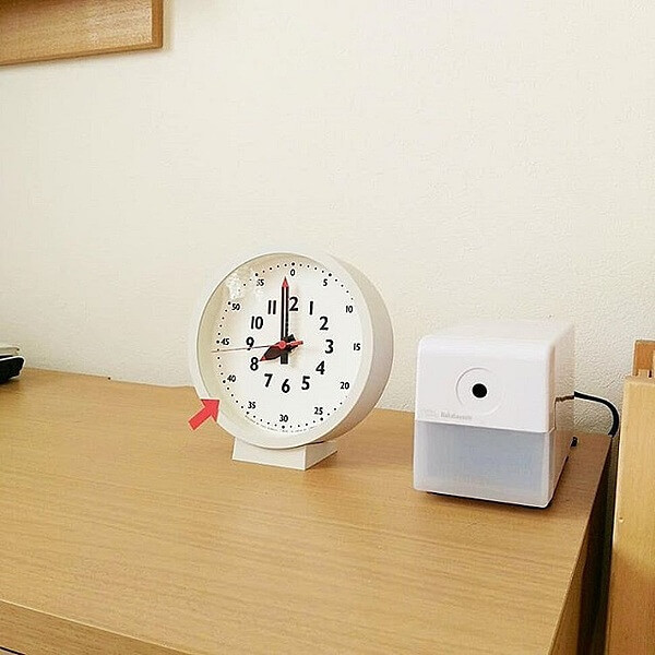 「我が家は矢印(写真の時計に貼っているもの)で、約束の時間を分かりやすく見せるようにしています。