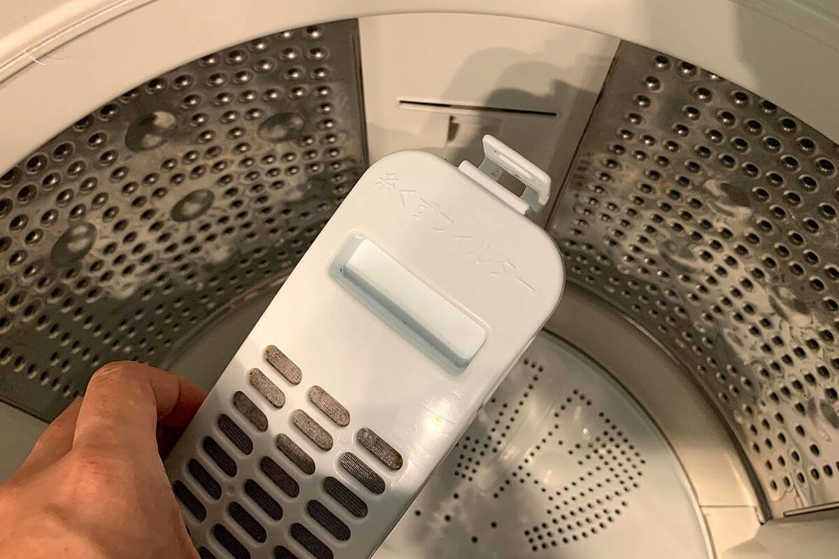 糸くずフィルターは、洗濯機本体から取り外し、ティッシュや歯ブラシなどで中のゴミをかきだします。