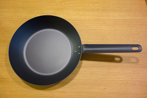 600円というリーズナブルな価格のフライパンは、26cmで二人分の朝ごはんはこれひとつで済ませられそうなサイズ感。耐熱150度のフッ素加工なので、日常使いにはぴったりです。