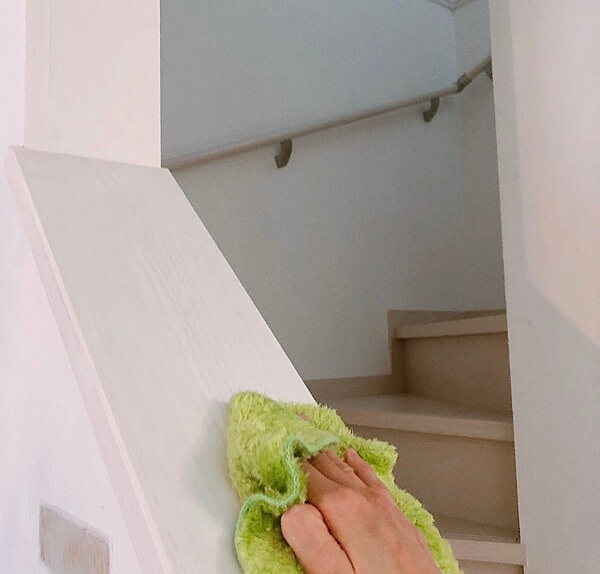 階段の手すり部分などを、スプレーして拭きます。木製家具は家の中に意外とあちこちにあります。
