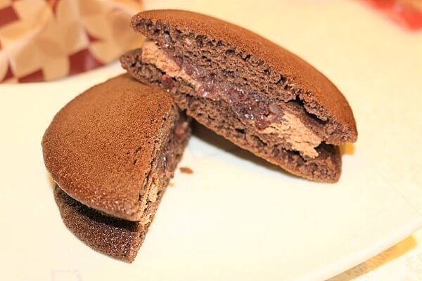 ココア生地のどら焼きにチョコ生クリームを併せた和洋折衷のスイーツです。