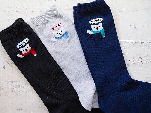 黒・グレー・紺のシンプルなカラーの、マフラーを巻いたクマのワンポイントが可愛いハイソックスです。