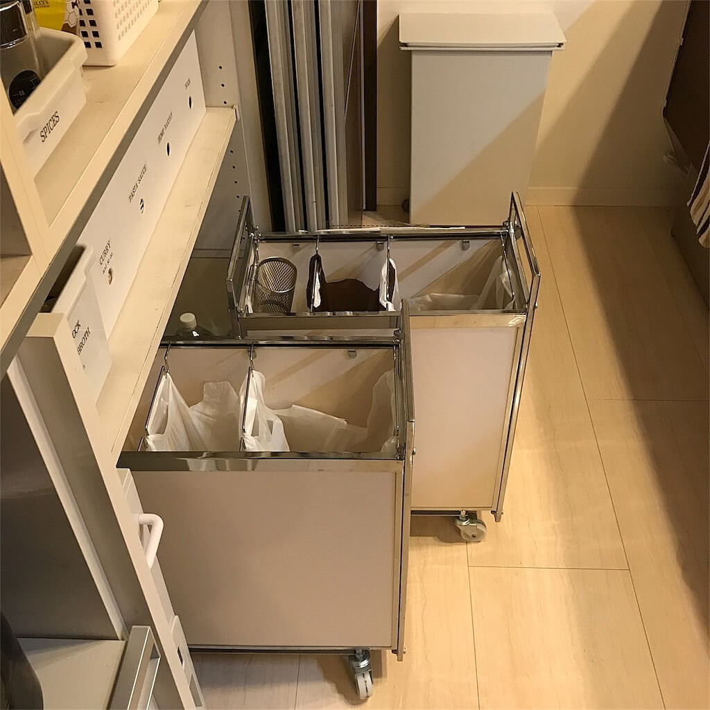 キッチンにはゴミ箱が不可欠で、かつ分別なので場所をとります。なのではじめからこの場所はゴミ箱用に空けておきました。