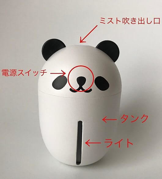 スイッチを押すと視界が白っぽくなるくらいにミストが出ます。また、機能は加湿だけでなくて前面部にライトもつくんです!!