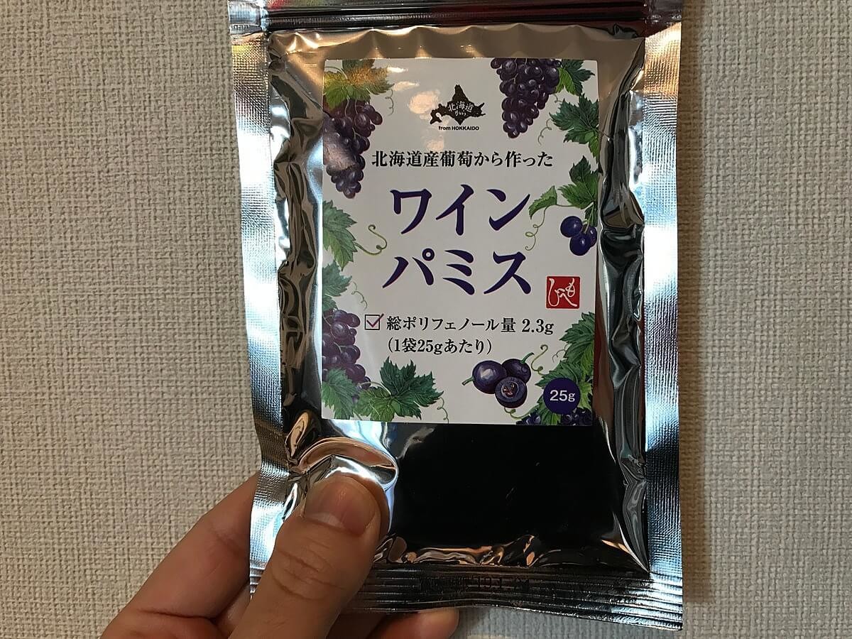 カルディコーヒーファームのHPによると「キャメルファームで収穫された、ワイン醸造過程で生まれる搾りかすを、特別製法で粉状に加工したワインパミス。ワインの香りと上品な苦味が味わえ、ワインには含まれないポリフェノールを豊富に含んでいます。ヨーグルトやスムージーに混ぜたり、クッキーなど焼き菓子作りにどうぞ。※アルコール分は含んでおりません。」とのこと。