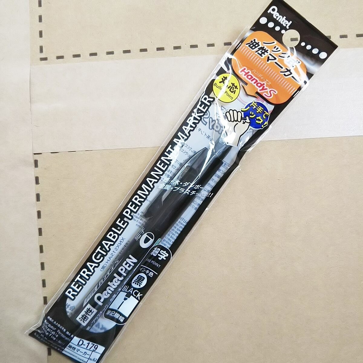 このノック式油性ペンはフタの置き場所に困ったり無くしてしまうことがありません。 上をカチっと押すだけで書けるので時短になります。