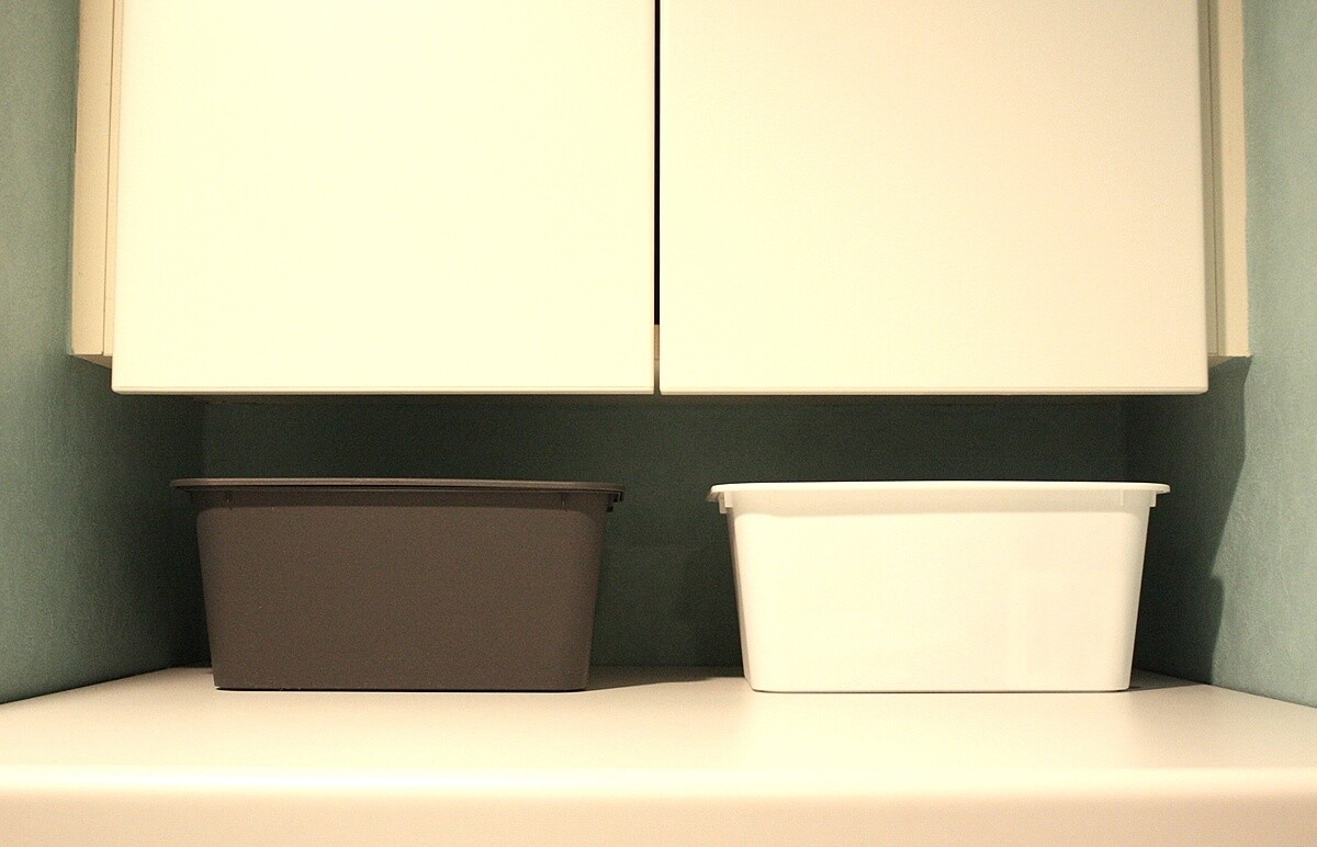 蓋つきでホコリがかぶりにくいので、ふだん使いしない洗面用具収納にぴったり。