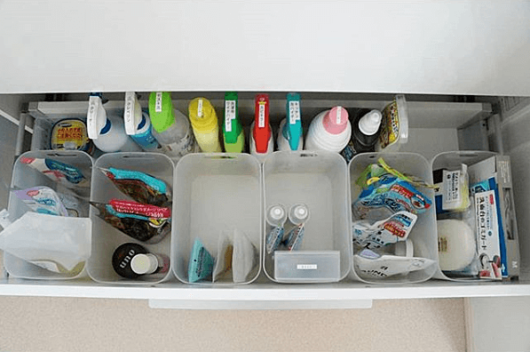 シンク下の収納にもダイソーの積み重ねボックスが活躍中。@usan.22さんのお家では、ダイソーの積み重ねボックスを35個以上使っているとか!