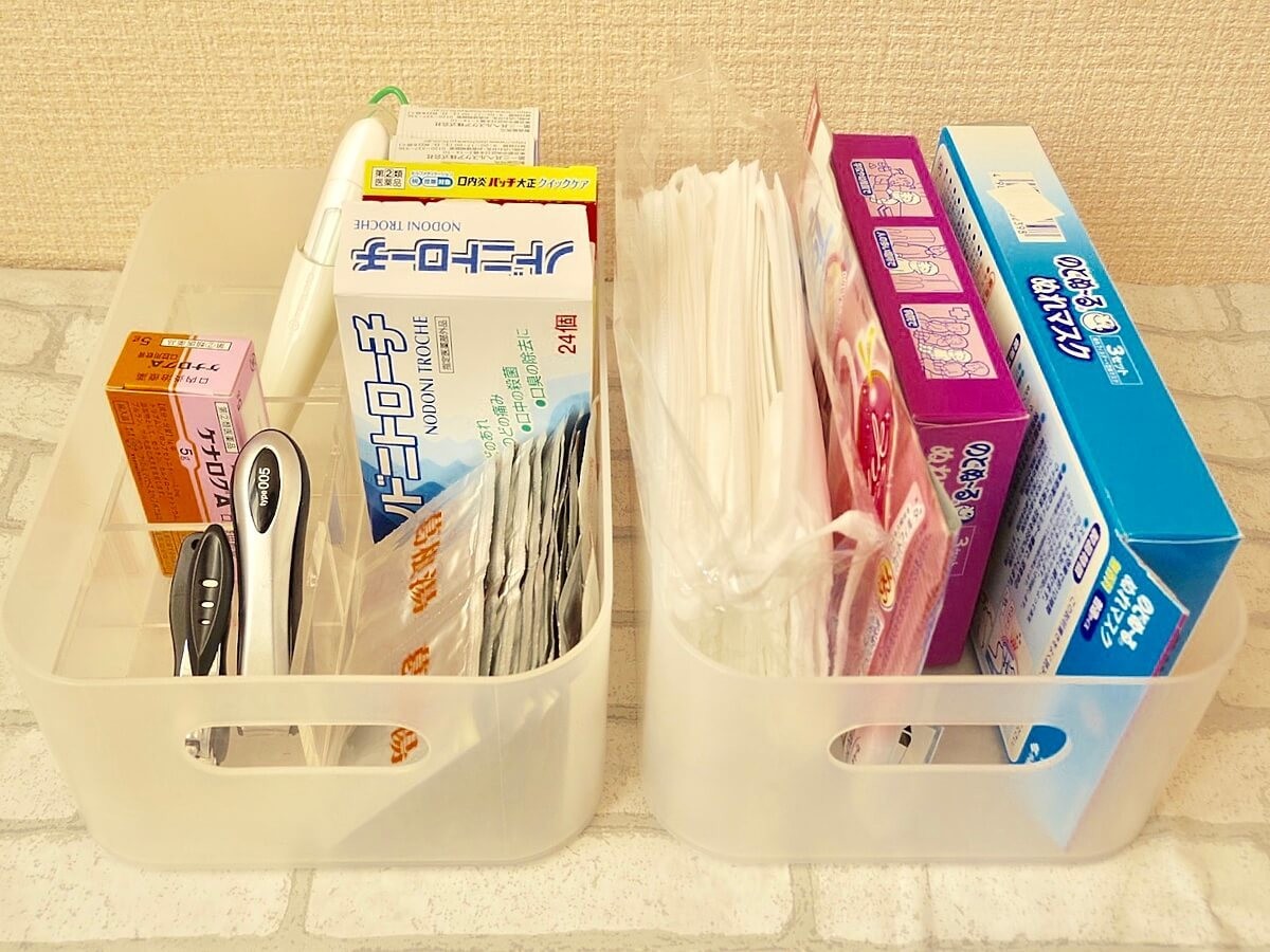左は体温計や爪切り、錠剤に粉薬。右にはマスクを入れています。このボックス2つを並べると、家の小物収納棚にジャストフィット。パントリー4段に2つずつ並べて使っています。