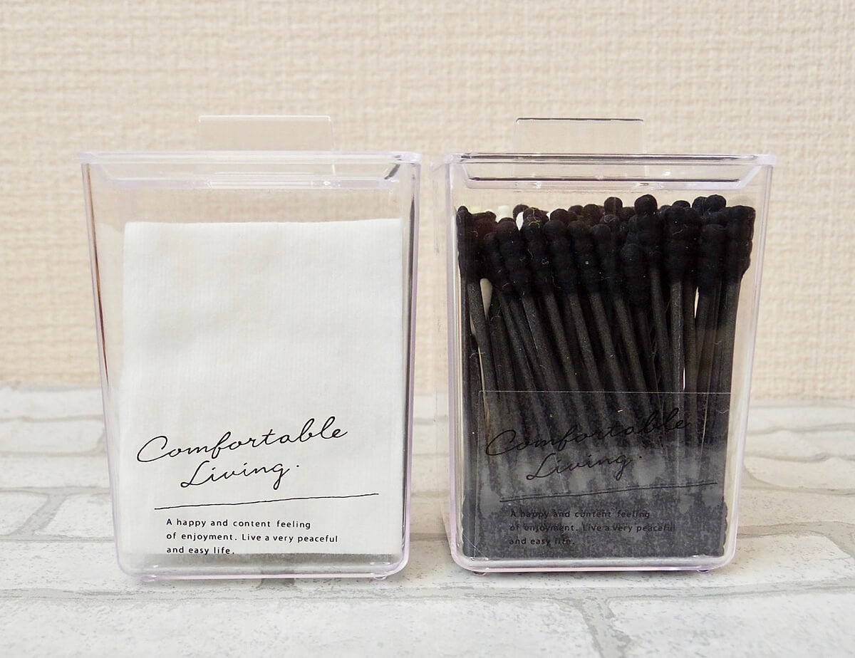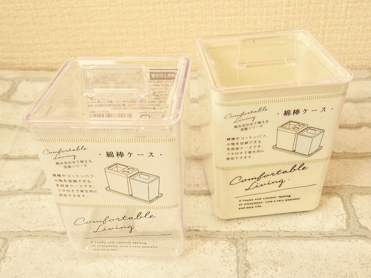 綿棒(左)やコットン(右)を入れるのにちょうどいい大きさで、蓋つきなのでホコリや湿気の心配もなし。