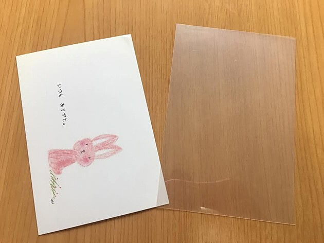 まず、ラミネートフィルムに、ラミネートしたい紙をはさみます。
