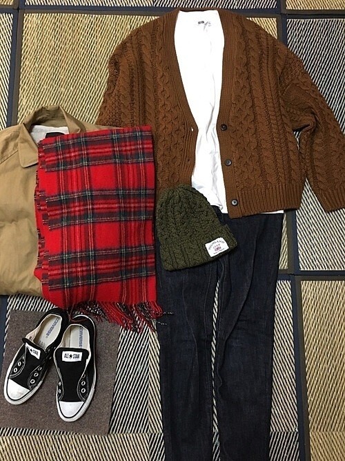 KBFのケーブルカーディガンを引き立たせて、ZOZOのスリムデニムでほっこりカジュアルに!