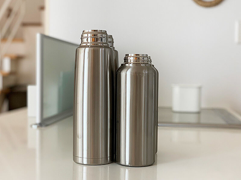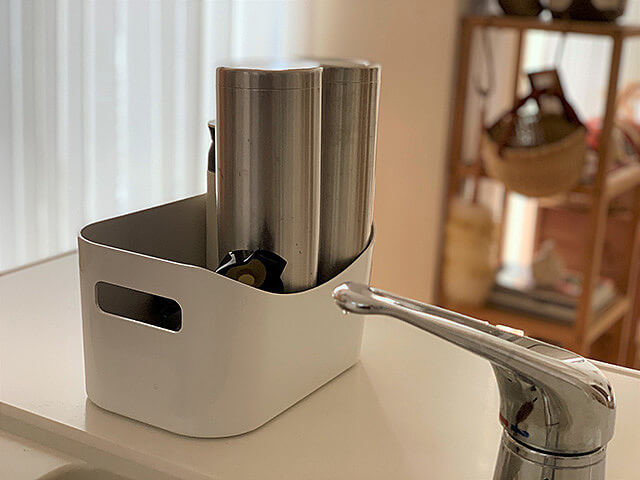 なるべく省スペースで収めたいことと、家事の手間を省くことから、毎日使う水筒は、なるべくシンプルで持ち手がないもの、柄がないものを選んで、食洗機で洗うことにしています。