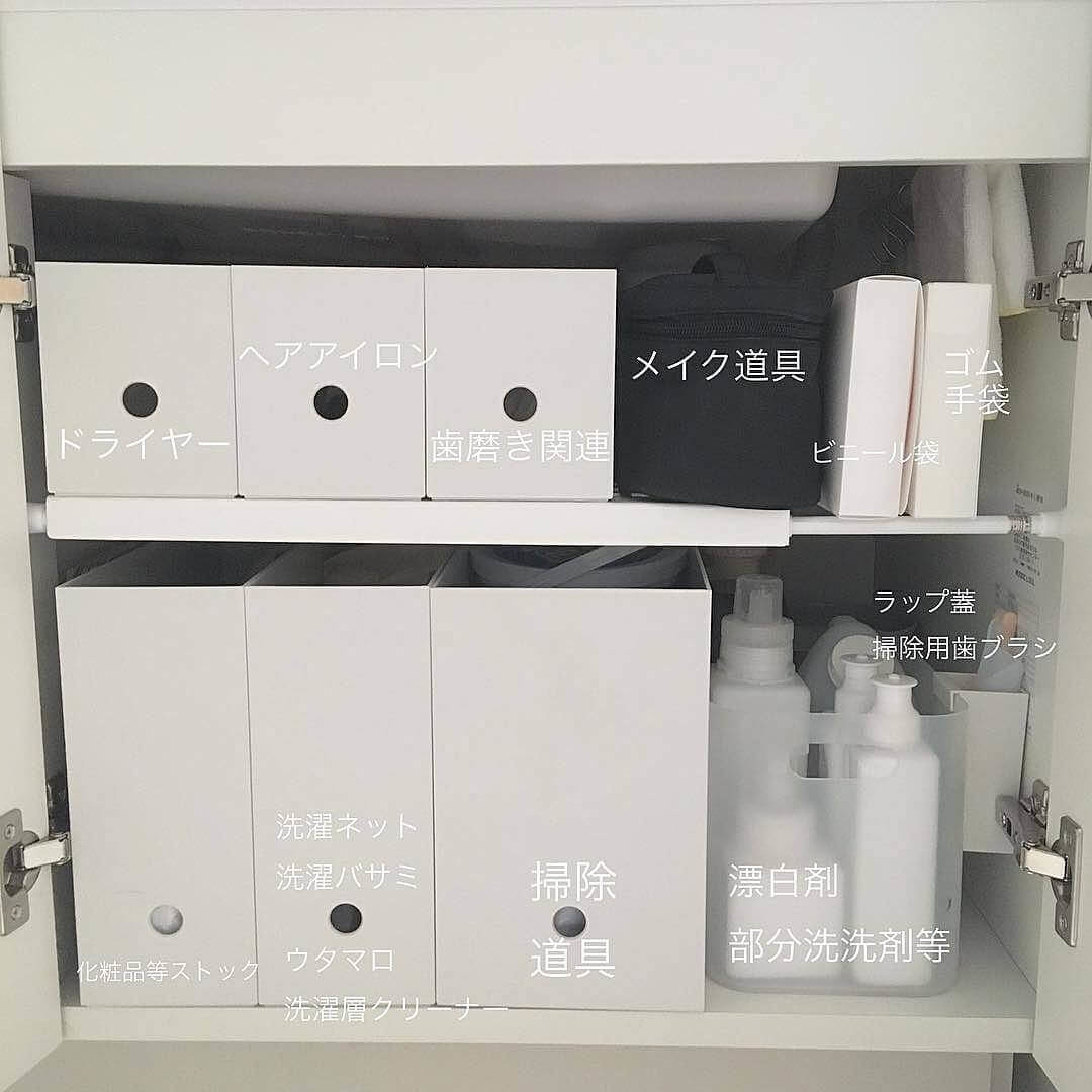 洗面台収納スペースは、タオル・洗剤・日用品ストックなど、無造作に入れると散乱しがちなアイテムが多いですよね。