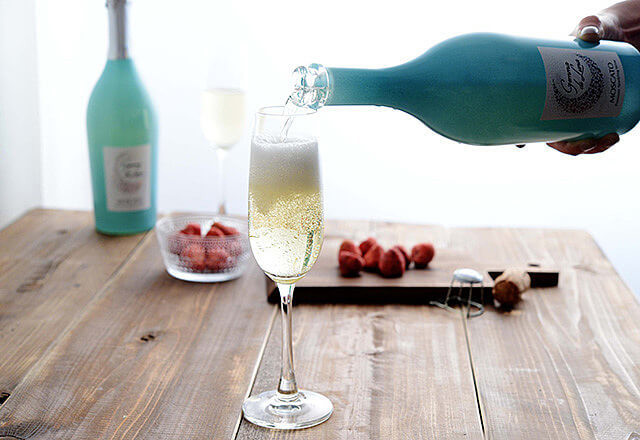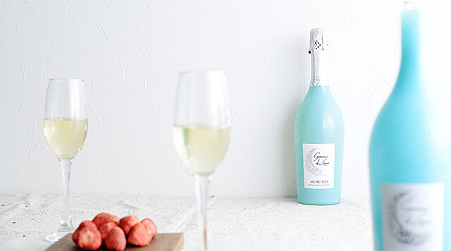 ミルキーブルーのボトルが目を引く、ジェンマ・ディ・ルナの甘口スパークリングワイン。