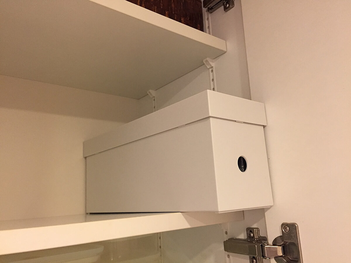 というわけで、ニトリのインボックスはお隣の吊り戸棚の一段低い場所に移動させ、フキンやペーパー類の収納に使うことに。