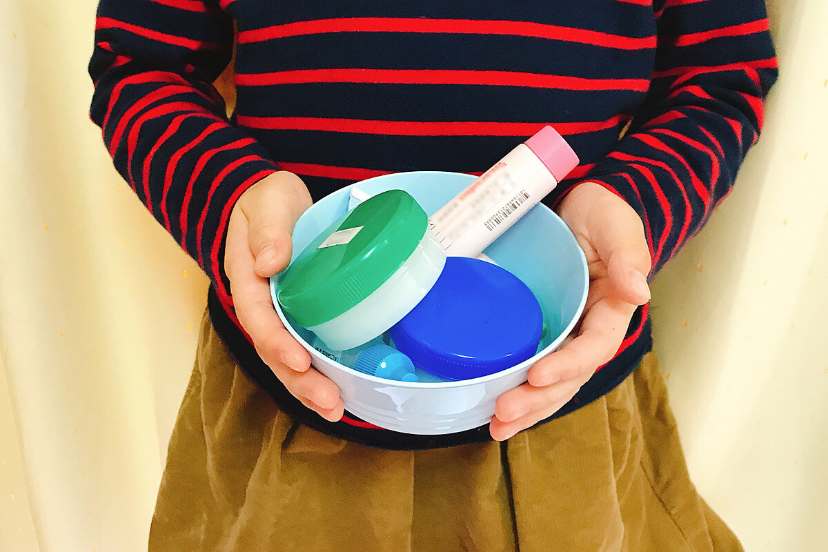 ペットボトルのキャップやトイレットペーパーの芯なんかがちょうど良い高さになりますが、なければ10円玉を重ねてもOKです。