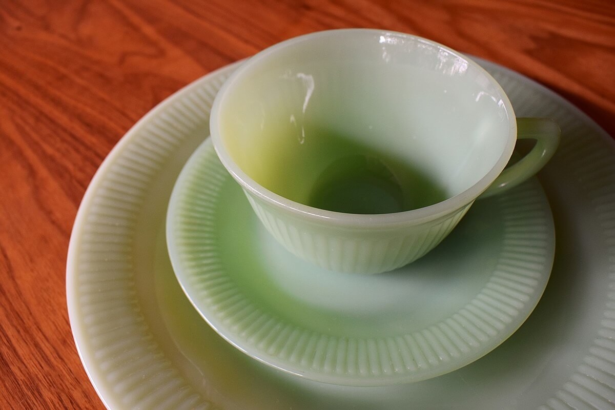 その透明感のあるグリーンが、本物に見劣りしないセリアのファイヤーキング食器。