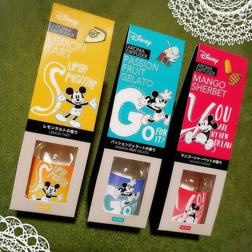 ダイソーでも取り扱いの多いアロマグッズがディズニー仕様になって登場!香りは全部で3種類あり左から「レモンタルトの香り」「パッションジェラートの香り」「マンゴーシャーベットの香り」になります。