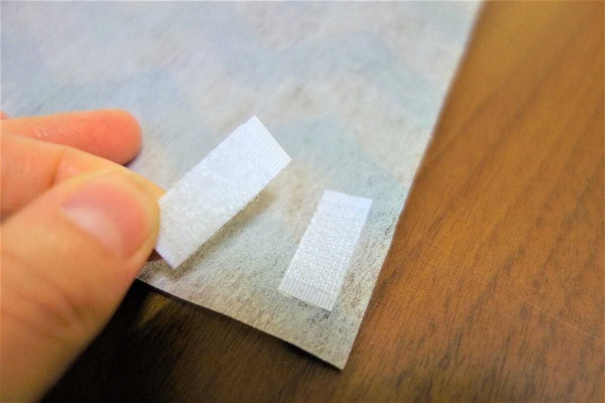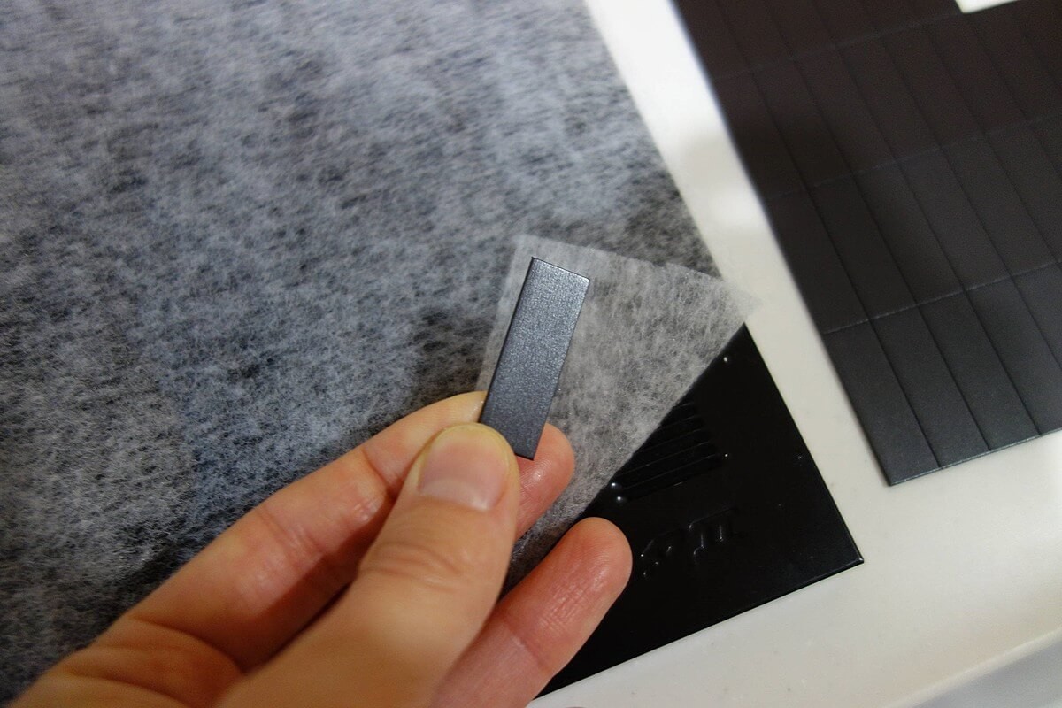 使い方はいたって簡単です。 マグネットの裏側が粘着シールになっているので、粘着部分をこのようにフィルターに取り付けてレンジフードカバーにセットするだけ。