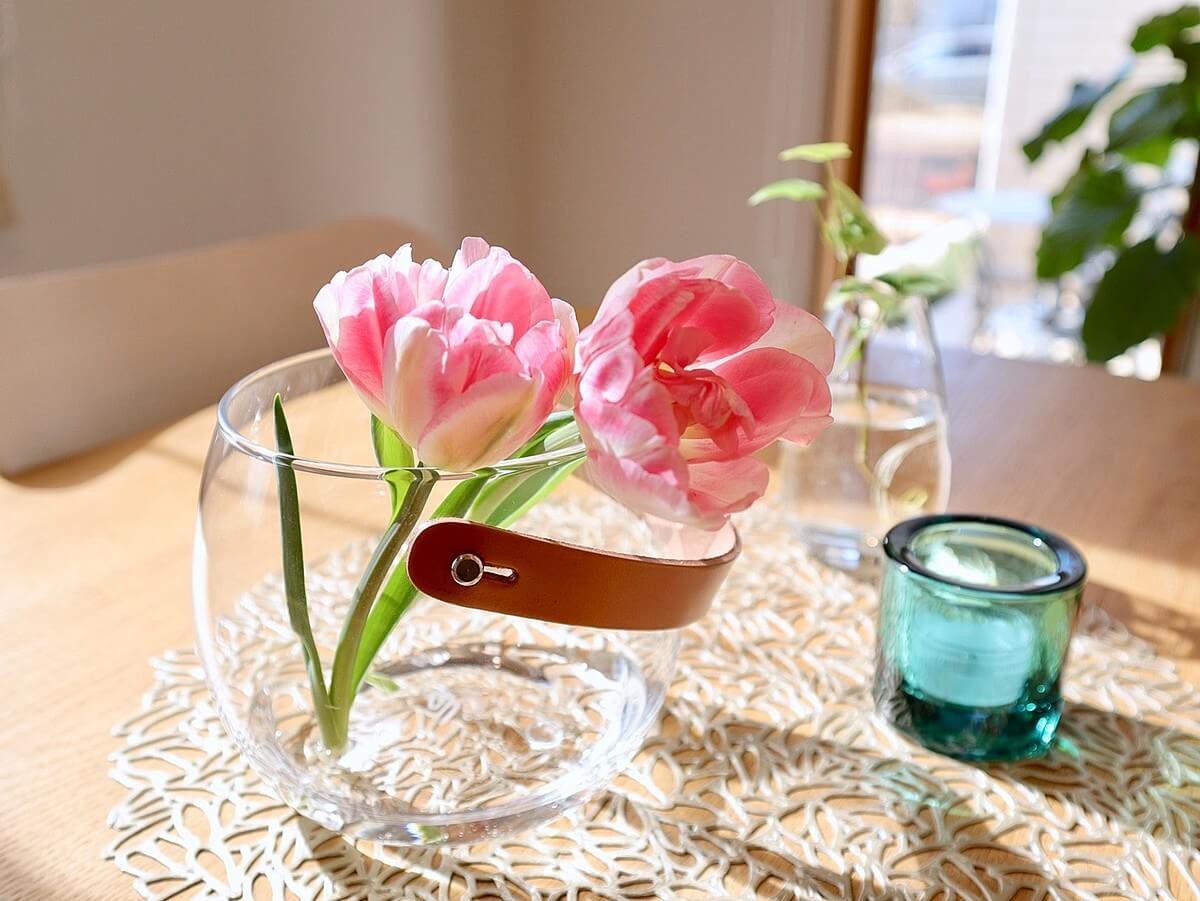 我が家で季節感を出すのに重宝しているのが、ホルムガードのポットです。吹きガラスにレザーの持ち手という組み合わせが他にない雰囲気を出してくれるこのポット。