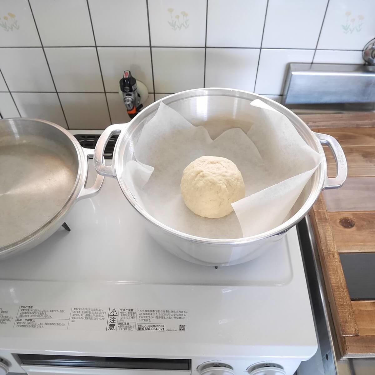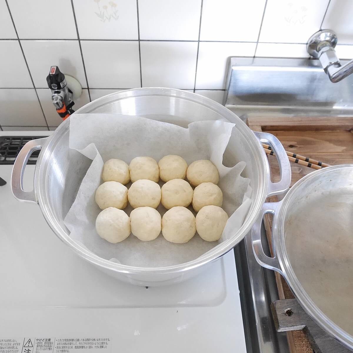 無水鍋(R)にクッキングシートを敷いて、丸めた生地を置き、蓋をして弱火で30秒くらい加熱します。お鍋の中がほんわり温まるくらい。