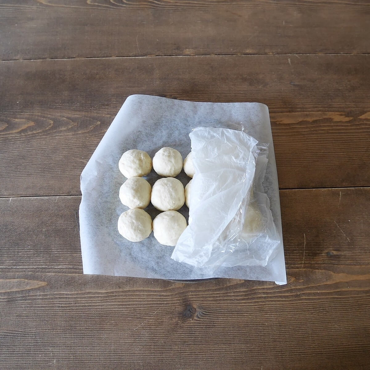 生地が1.5倍から2倍程度に膨らんだら、もう一度軽く捏ねてガス抜きをし、12等分して小さく丸めます。 この時中にチーズやドライフルーツなど入れても美味しいです。