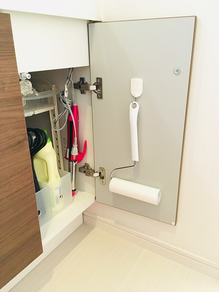 それだけ使うことが多いので、すぐ手元にコロコロを置いておきたいもの。 洗面台の扉を開くとすぐにコロコロがあります♪