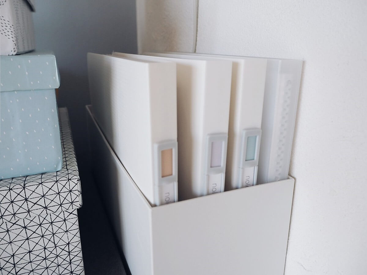 家族分のファイルを3冊購入して付属のシールで色分けをして、無印良品のファイルボックスに入れてリビングの隅っこに置いています。
