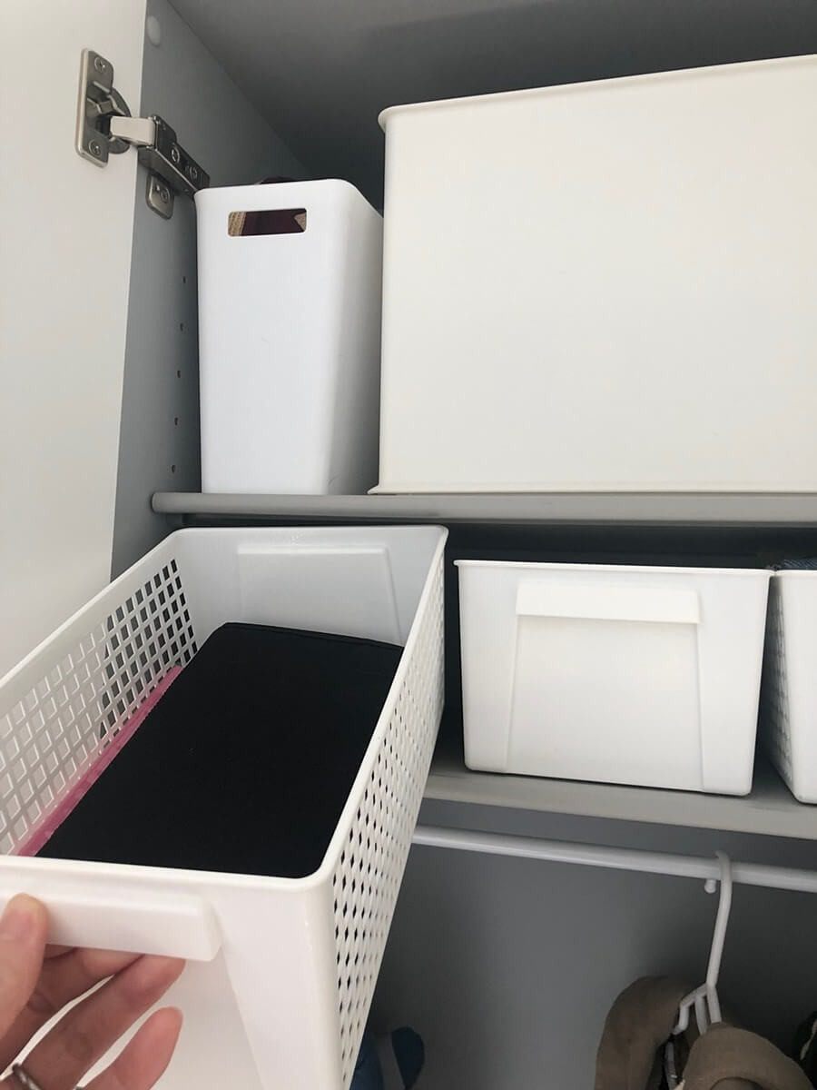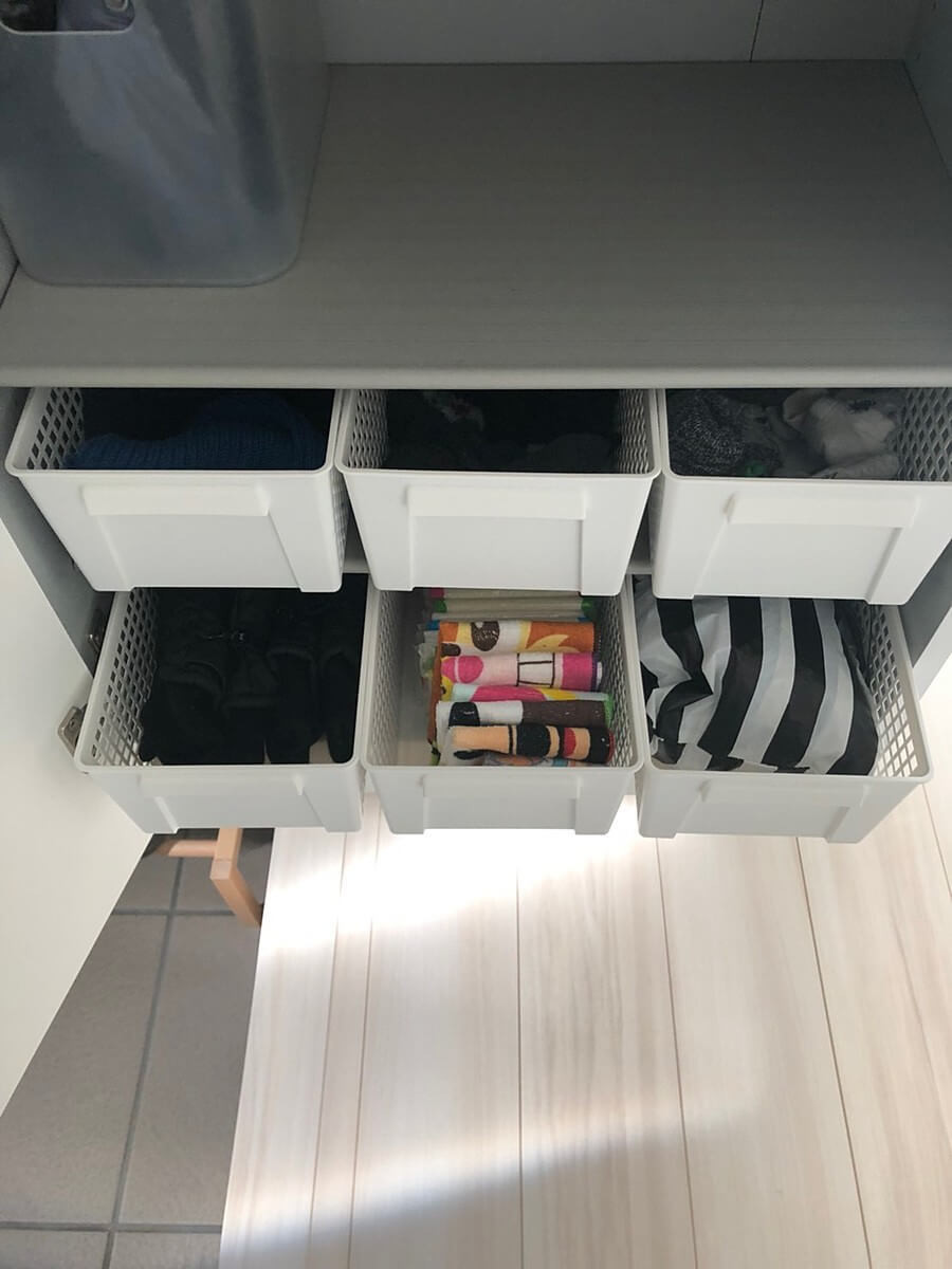 子どもの手の届く下段のボックスには靴下、ハンカチ、手袋などを収納しています。
